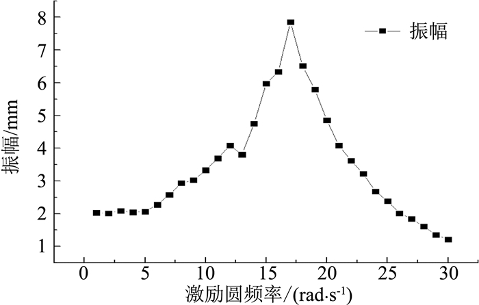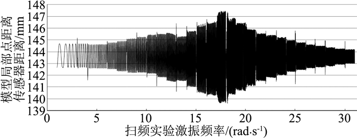 3.2 实验结果测试的激光位移传感器位于模型上部,测量数据为激光位移传感器本身到模型上固定点到的距离,如此测量获得在电流强度为1+sin(ωt)A的安培力的条件下结构的扫频曲线如图 6所示。