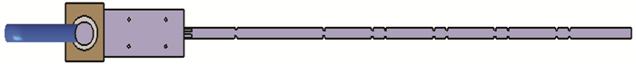 2 试验模型模型采用铝合金材料制造,铝合金材料模型尺寸为920 mm×14 mm×2 mm的铝合金长条,由于是原理性试验,试验模型并不代表某一具体的飞行器结构。模型一端长120 mm的部分插入夹具中,使用螺钉夹紧固定,模型的其它800 mm部分向外伸出,构成悬臂梁。不考虑模型自重,模型在夹具中的振型和频率如图 4所示,其中,模型和夹具整体结构的一阶振型为一阶面外弯曲;二阶振型为二阶面外弯曲;三阶振型为一阶面内弯曲。模型夹具使用超硬铝7075制造,对模型进行夹紧固定。