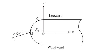 计算模型为钝平板,模型示意图如图 2所示,其中x、y分别为沿轴向以及垂直于轴向,坐标原点选在钝头圆心处。点A所示位置为钝平板前缘,ξ为从前缘沿壁面的贴体弧长,AOA为迎角,Rn为有量纲圆头半径。在下文中,迎风面以及下平板指的是流场或平板对应y < 0的区域,背风面以及上平板指的是流场或平板对应y>0的区域。本文计算了不同迎角、不同球头半径下马赫数15、壁面温度为2000K的工况,具体参数在表 1列出。来流为70 km高空气体,其物理参数为: