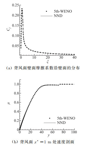 对于高超声速稀薄流动,对黏性项的刻画至关重要。由此,在图 3中给出了Case 1工况二阶NND格式与五阶WENO[25] (Weighed Essentially Non-Oscillatory)格式(黏性项采用六阶中心差分)计算得到的壁面摩擦系数与速度剖面比较的结果。其中ξ为沿壁面弧长,壁面摩擦系数计算式为: