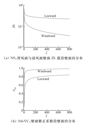 图 4给出的是用NS方法计算得到的Zh值在空间分布的等值线图。可以看到,Zh值比较大的地方主要集中在激波、头部和背风面壁面附近,说明这些位置是流动中稀薄效应最强的区域。图 5(a)给出的是NS方法计算得到的Zh值在背风面和迎风面沿壁面的分布。可以看到Zh值都是先增大后减小,在平板圆头与板身相接的位置取得最大值。图 5(b)给出的是NS-VC计算收敛时背风面与迎风面壁面修正系数沿流向的分布。与图 5(a)中Zh值变化趋势相反,黏性修正系数先减小后增大,在平板圆头与板身相接处最小。这是由于Zh值越大,表征稀薄效应越强,因此黏性修正得越多。对于ξ>100,背风面黏性修正系数介于0.7与0.8之间,即修正后的等效黏性系数为原来黏性系数的70%~80%。迎风面的Zh值比背风面的小很多,因此对黏性系数的修正量也很小。