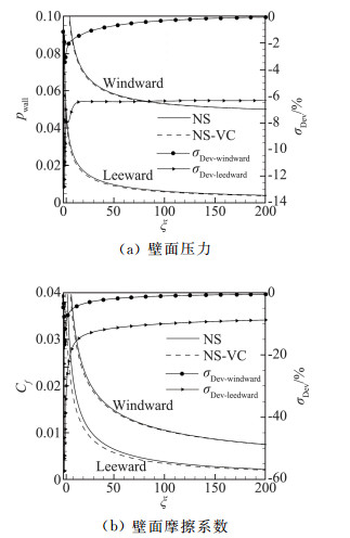 图 6给出了有黏性修正与无修正情况下壁面压力、壁面摩擦系数以及相对变化率(σDev)沿壁面的变化,其中相对变化率是(NS-VC结果-NS结果)/(NS结果)。从图中可以看到黏性修正使得壁面压力与壁面摩擦系数均减小,其中对背风面的影响比迎风面大很多。由图 6(a)可以看到,黏性修正使得背风面的壁面压力相对于无修正来说在大部分地区均约减小6%左右。而图 6(b)可看出,黏性修正使得背风面的壁面摩擦系数相对于无修正来说减小最多为57%,而在ξ>100以后,则从11%逐步降至7%左右。即稀薄效应对背风面的壁面压力以及摩擦力均会造成比较大的影响。但对迎风面来说,则稀薄效应的影响很小。