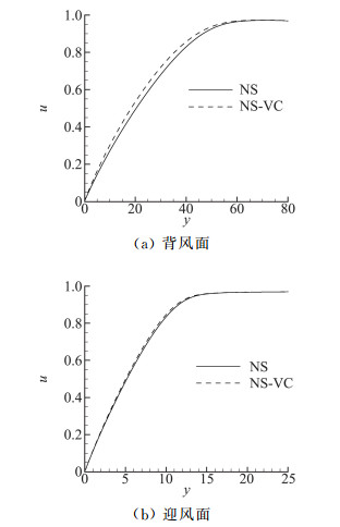图 7给出了背风面与迎风面在x*=1 m处速度沿壁面法向分布的剖面。由图 7可以看到,黏性修正使得边界层内的速度梯度增大,在背风面的修正效果比迎风面强很多。