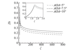 图 8给出的是迎角分别为5°、7.5°、10°情况下背风面壁面Zh值随壁面弧长的变化,右上角为头部的局部放大图,圆头与平板相切的位置大约在ξ=1.57处。可以看到不同迎角的壁面Zh值变化规律相似,都是先增大后减小,在头部附近急剧变化,并在圆头与板身相切的位置附近取得最大值。对比三个迎角的结果可以发现,迎角越大,其背风面壁面Zh值越大,表示其稀薄程度也越大。