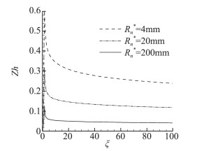 图 9 不同头部半径壁面Zh值沿壁面的变化 Fig.9 Variation of Zh value along wall surface with different head radii |