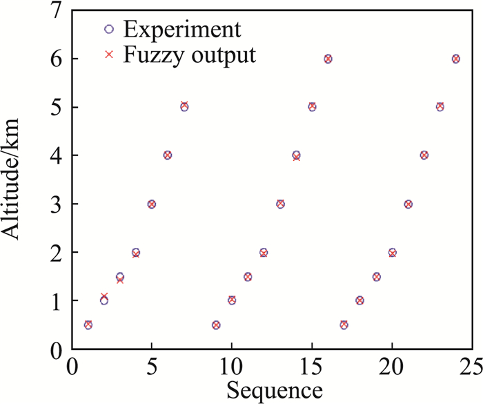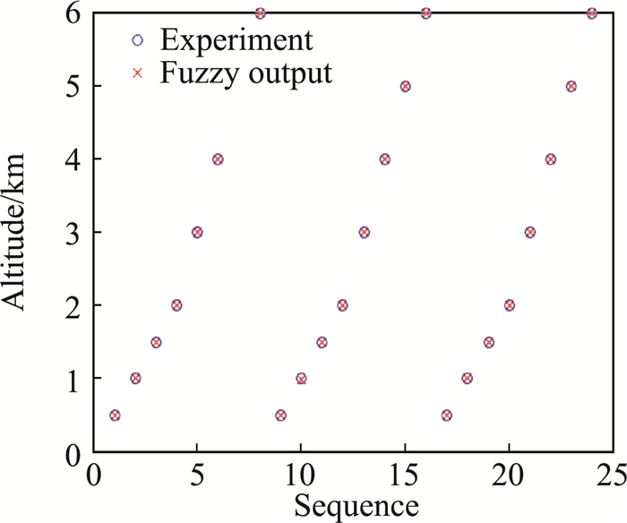 图 11 海拔高度模糊结构输出与试验值对比(梯形隶属函数) Fig.11 Comparison between modeling results and experimental altitude (trapezoid membership function) |