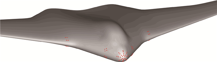 1 风洞试验及CFD仿真 1.1 风洞试验部分试验在南京航空航天大学NH-2低速风洞进行。风洞试验段截面为3.0 m×2.5 m的矩形,试验模型为某飞翼布局飞行器,表面共布置62个测压点,头部分布46个测压点,内翼左右各分布8个测压点,位置基本对称(图 1、图 2)。测压采用内埋测压管的方式,测压管内径0.3 mm。每个测压管均与压力测量模块相连。