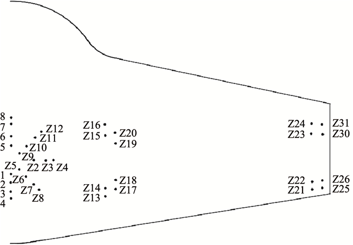 图 3中给出了半侧机身上的测压点分布,除1~8号测压孔外,另半侧机身上的测压孔分布与图中“Z”开头编号的测压孔对称,相对应的编号以“Y”开头,例如“Z18”对应“Y18”。