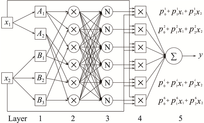 第1层表示对于两个输入量x1、x2各分配若干个隶属函数,分别是A1、A2、B1、B2、B3。