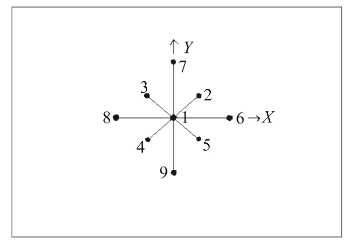 5 三维效应修正模型算例验证算例模型采用外径0.2m,厚度0.03m的空心半球壳,如图 9所示。材料比热cp=500 J/(kg·K),密度ρ=8000 kg/m3,导热系数k=80 W/(m·K),初始温度300 K,时间步长0.2 s,总加热时间200 s,时间步r取30,测温点数量为9个,呈放射状均布于内壁面,布局在底面投影示意图如图 10所示。测点1位于球壳端部,内侧2-5测点距离测点1约0.03 m,外侧6-9测点距离测点1约0.06 m。