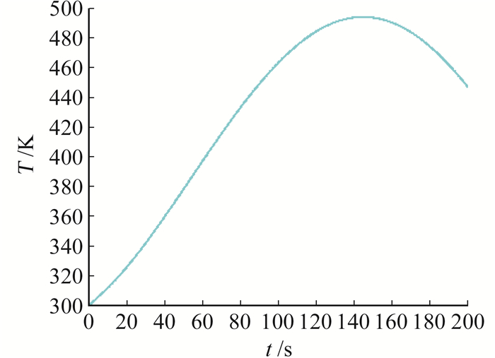 在ANSYS APDL中加载(17)形式的热流边界条件,端部测点1的温度随时间变化如图 12所示。测点温度先升高后降低,是因为材料内部的热扩散是三维的,表面热流空间分布极不均匀,且随时间先增大后减小,测点周围单元的热扩散从以径向扩散升温为主,逐步转变为以周向扩散降温为主。
