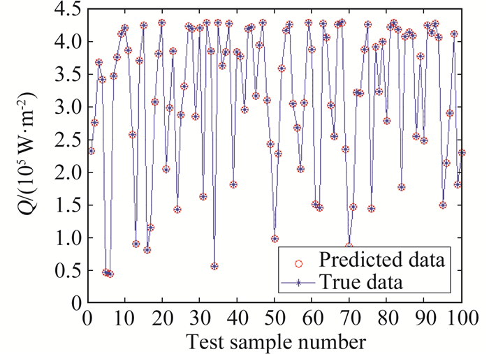 n,l,m分别为输入层,隐含层和输出层节点数,a为0~10之间的常数,本文分别设置隐含层神经元数目5~17。网络隐含层和输出层激发函数分别采用logsig和purelin函数,最大迭代训练次数为100,粒子群算法中,加速度因子设为1.49,惯性权重为0.5,粒子群规模为20个粒子,寻优迭代次数为100。当隐含层节点数为16时,粒子群群体最佳适应度值随寻优次数变化如图 14所示,图 15为训练后的网络峰值热流预测值与真实值比较结果,图 16为神经网络预测误差。将测试样本输出按时间顺序排列后与真实热流对比结果如图 17所示。