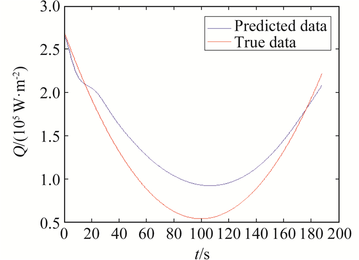 同样采用有限元软件计算出9个测点的时变温度数据,并叠加标准差0.5K的零均值白噪声作为后续输入数据,将一维的热流辨识结果输入前文已经建立的BP网络修正模型,驻点热流预测结果与实际值比较如图 20所示。