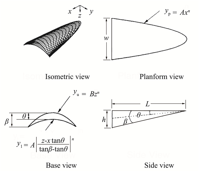 该方法是在假定前缘激波附体条件下设计乘波构形,并非所有变量都会得到有附体激波的、符合实际的外形。对有附体激波的下表面,β必须小于最大的激波附着角。激波附体的限制将变量减至四个:A、n、L、θ。
