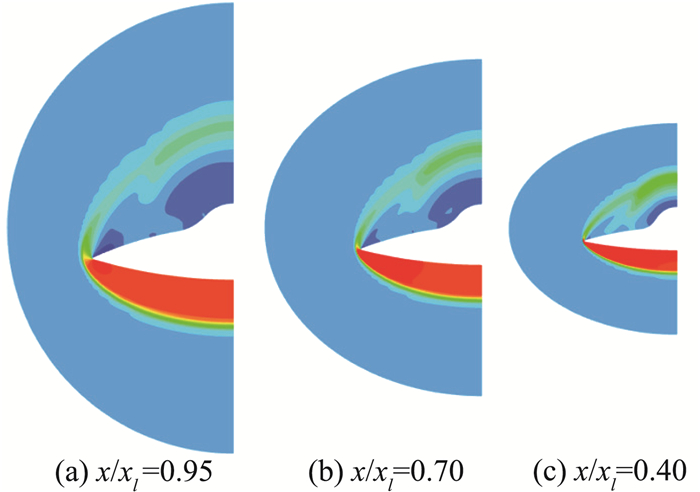 图 10是对称面的压力分布,可以发现上表面前缘激波后的流动在逐渐膨胀,膨胀段主要集中在前段;图 11是乘波构型轴向不同位置横截面压力分布,可知上表面膨胀波的作用使得机身中后段的压强进一步下降,显著低于来流压强;由于对前缘进行了钝化,以及黏性的综合影响,在横截面内边缘处出现了溢流现象,但由于钝化半径较小,并且给定容积空间设计方法对上表面边缘区并无影响,因此激波脱体程度较小。总体来说,相较于采用自由流面的理想乘波构型,经钝化和给定容积空间设计的乘波构型改善了容积率低的缺点,并且依然具有良好的乘波特性,可以说该设计方法在高超声速乘波构型气动布局中的应用是成功的。