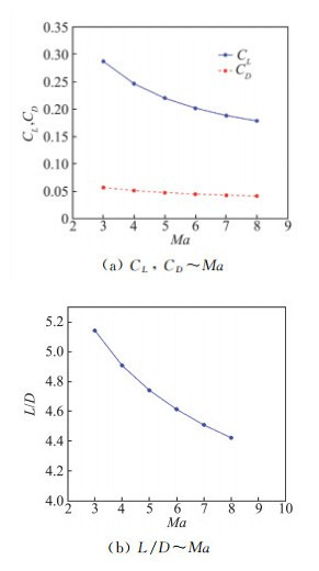 图 14为经给定容积空间设计的乘波构型在迎角为2°时的升、阻力系数随马赫数的变化曲线。由图可知,随着马赫数的增加,升力系数下降,故在马赫数较低时,乘波构型可以承载更多的载重,但随着飞行器加速的同时,燃料逐渐消耗,飞行器重量下降,因此随马赫数的增加,升力系数的下降是可以接受的;随着马赫数的增加,阻力系数也下降,但下降速率小于升力系数,造成升阻比略有下降,这符合高超声速时的L/D与Ma关系的一般规律;升阻比下降幅度较小,平均下降速率约为3%,此外随着马赫数增加,升阻比下降速率越来越小。总体上经给定容积空间设计的乘波构型在较大的马赫数范围内都能保持优良的气动特性。