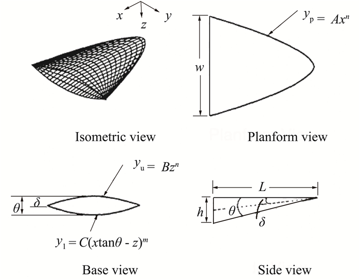 1 楔导乘波构型设计楔导乘波构型的前缘曲线及其上表面由幂函数定义,分为常楔角和变楔角两种生成方法。常楔角乘波构型如图 1所示,参数A、B是正的比例常数,幂指数n取值范围在0~1之间。为保证激波是平面的,即源于楔形流场,楔形角θ须为常数。通过控制这5个变量(A,B,n,L,θ)可生成不同乘波构形。