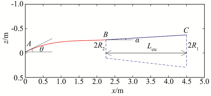 在经过前缘钝化后的乘波构型上表面设置代表有效容积的偏心圆台。按照幂数函数上表面设计方法[18]先给定纵向对称面的脊线,如图 3所示。脊线的长度为乘波构型的长度,其形状由偏心圆台长度Lctc、上下表面半径R2、R1及圆台中心线位置共同决定。而圆台中心线位置由偏心圆台几何参数和乘波构型下表面形状共同决定,目标是使得在圆台长度范围内乘波构型横截面内都可容纳对应的圆台截面圆。图 3中蓝线区域BC对应偏心圆台区域,红线区域AB通过前缘顶点A的位置、膨胀角θ、与偏心圆台相接处B点的位置及对应角度α采用Hermite插值函数确定:
