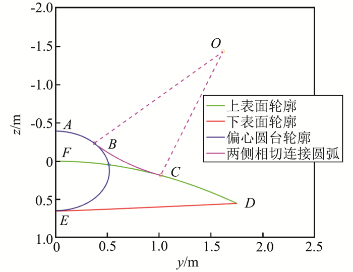 在得到上表面脊线之后,就可以沿乘波构型轴向设计各横截面内的上表面轮廓线。由于乘波构型关于其纵向中心面对称,研究其横截面一侧即可,以某一横截面为例,如图 4所示,图中绿色实线FCD表示该截面内的上表面原始轮廓线,红色实线ED表示下表面轮廓线,蓝色实线ABE表示相应的偏心圆台轮廓线,偏心圆台轮廓线和下表面轮廓线相切,在偏心圆台和上表面交点附近用一段相切圆弧连接,图中以O点为圆心的紫色圆弧在B点与偏心圆台相切,在C点与上表面相切。最终设计后的上表面轮廓线如图中ABCD曲线。