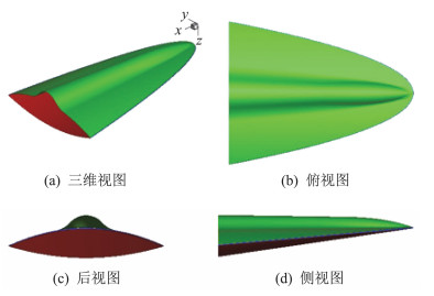 对主动冷却方式来说,钝化半径可取为1~3 cm[19],本文采用增加材料的钝化方法,钝化半径取乘波构型长度的0.25%(1.125 cm)。在钝化的基础上,通过图 4所示的给定容积上表面参数化设计法得到的乘波构型如图 5所示,绿色区域为乘波构型上表面,红色区域为乘波构型下表面,蓝色区域为钝化前缘区域。