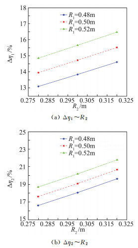 表 1为原始乘波构型和偏心圆台上下表面半径R2、R1选取不同数值的经上表面设计得到的乘波构型的几何参数。图 7分别是参考面积为浸润面积和投影面积时,设计后的乘波构型容积率较原始外形提升的百分比与半径R2、R1的关系曲线。由图 7可以看出,无论参考面积选取哪种,给定容积设计方法得到的乘波构型容积率较原始外形都得到较大提升,并且容积率增加的百分比与设计参数R2、R1呈线性关系。
