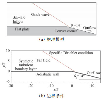 1 计算描述和程序验证 1.1 计算描述如图 1所示,本文所研究的模型中,凸拐角偏转角度为θc=14°。来流马赫数Ma=3.0, 总温T0=810 K,总压P0=1.27 MPa。根据以上来流条件的单位雷诺数Re=4.7×106 m-1。做为对比,本文分别考察尖拐角和钝拐角(倒圆半径为20 mm)两种模型。如图 1所示,本文将凸拐角肩点的流向坐标设为x= 0。