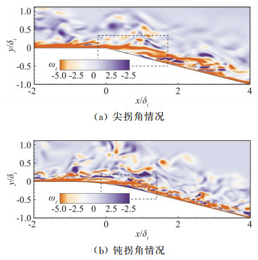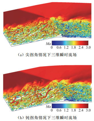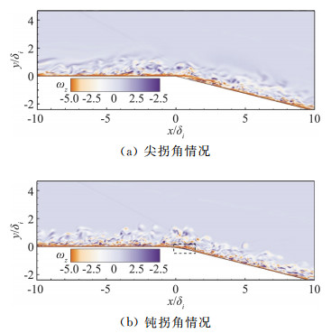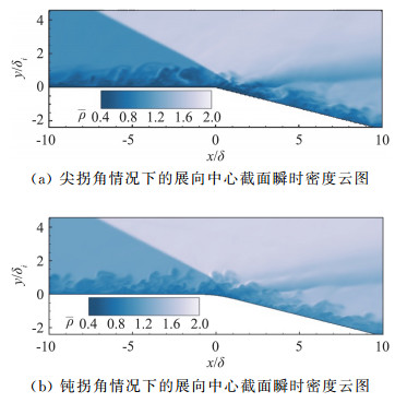 2.2 瞬时流场特征图 6的平均流场显示入射激波清晰可见,反射激波则较为模糊,表明激波经凸拐角区域干扰作用后非定常特性明显增强。图 8(a)和图 8(b)分别显示了在尖拐角和钝拐角两种情况下,展向中心截面瞬时密度云图呈现“皱纹状”分布[25]。边界层流动的间歇结构与壁面斜交并向下游运动,且经入射激波作用之后,凸拐角下游的“皱纹状”脉动结构能够一直维持。