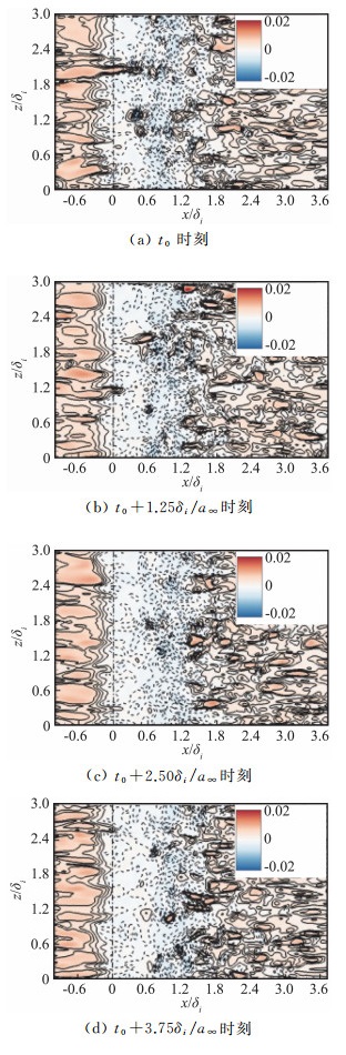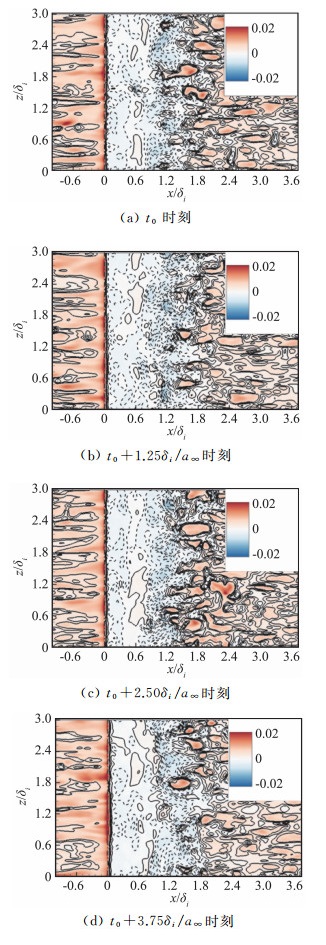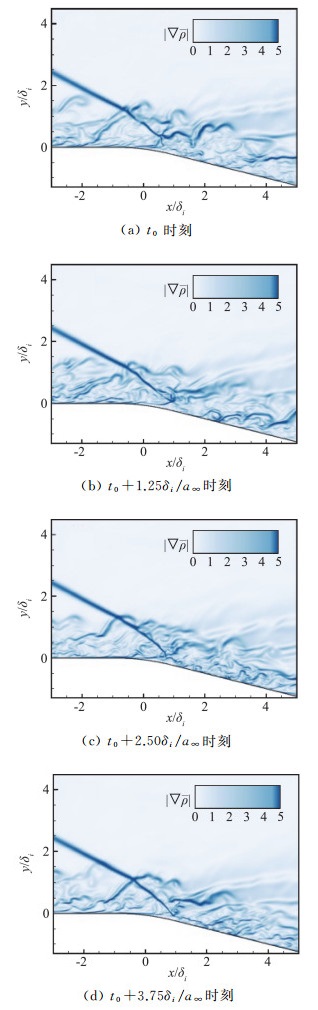 激波与湍流边界层干扰流动问题中,涉及到入射激波、反射激波以及分离泡的复杂非定常运动[27]。通过计算流场瞬时数值纹影图(密度梯度幅值| ∇ρ|),图 12给出了尖拐角情况下典型时刻展向中心截面内的数值纹影图,时间间隔为1.25δi/a∞。从图中可以看出,激波入射引起流动分离,使得拐角之后的流动偏折加剧,从而在膨胀波后形成压缩波,并最终形成反射激波。对于入射激波来说,来流的顺时针旋涡结构会使其偏折,导致激波角增大,这一现象与Pirozzoli[21]等人研究的斜激波入射平板边界层流动类似。另一方面,尖拐角后缘的剪切层在遇到入射激波之前结构明显,这与图 9所示的在这一区域小尺度涡结构急剧减弱有关,而剪切层在受入射激波干扰之后迅速失稳,致使波后流场小尺度涡结构增强。