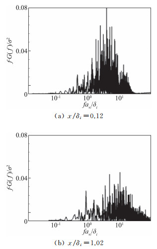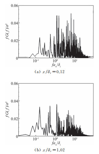 壁面压力信号的频谱分析有助于进一步理解流场的非定常特性。这里表征频率的无量纲量为St=fa∞/δi。由于功率谱密度函数G(f)描述了脉动压力均方根σ在频域区间的分布特性,我们可以采用fG(f)/σ2来分析壁面压力频谱的分布特性[28]。图 16和图 17显示了尖拐角和钝拐角情况下在流动分离点与再附点附近的壁面压力频谱。从图中可以看出,分离泡区域流动呈现出明显的高频脉动特性,对应的频率与上游湍流边界层的特征频率相近[26],这表明流场中湍流仍保持充分发展状态,并未因凸拐角作用而发生再层流化。