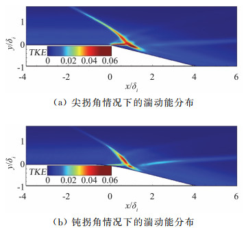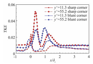 湍动能可以用来表征流体脉动运动的强弱。图 19给出了以来流参数无量纲化的湍动能(Turbulent Kinetic Energy, TKE)分布。图 19(a)显示,流动经过尖拐角后立即产生分离,导致流体脉动运动增强。一方面,来流湍流边界层大尺度结构与激波相互作用通常会引起激波的“褶皱”[30],从而产生激波非定常运动。另一方面,拐角后缘的剪切层失稳强度由小尺度涡结构决定,且与拐角附近流动沿流向从顺压梯度转变为逆压梯度密切相关。从图 19(a,b)可以看出,与尖拐角情况相比,钝拐角情况下湍动能在分离泡周围的分布显著不同。在尖拐角情况下,流动经过拐角先受顺压梯度作用导致小尺度涡结构衰减,后受逆压梯度作用导致剪切层迅速失稳。相对而言,流动经历了更为急剧的压力梯度转变过程,剪切层脉动相对更为强烈,因而剪切层区域湍动能较强。而钝拐角情况下的顺压梯度较弱,对小尺度涡结构影响相对较小,因此流场的局部脉动运动主要出现在小尺度涡结构较强的激波脚和分离泡区域。