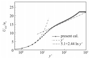 图 3 x/δi=-10处湍流边界层经过van Driest变换之后的平均流向速度分布 Fig.3 Average velocity distribution in turbulent boundary layer after van Driest transform at x/δi=-10 |