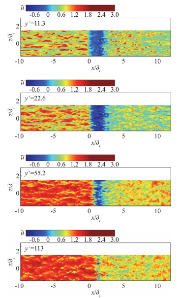 通过湍流边界层瞬时结构如不同法向平面的流向速度条带,可考察来流湍流边界层的发展程度。如图 4所示,充分发展的湍流边界层内存在沿流向延伸的长条带结构,这种条带结构直接反映了高速流体与低速流体沿展向交替出现的现象,以及湍流边界层流动的间歇特性。这与前人的研究结果是一致的[20]。