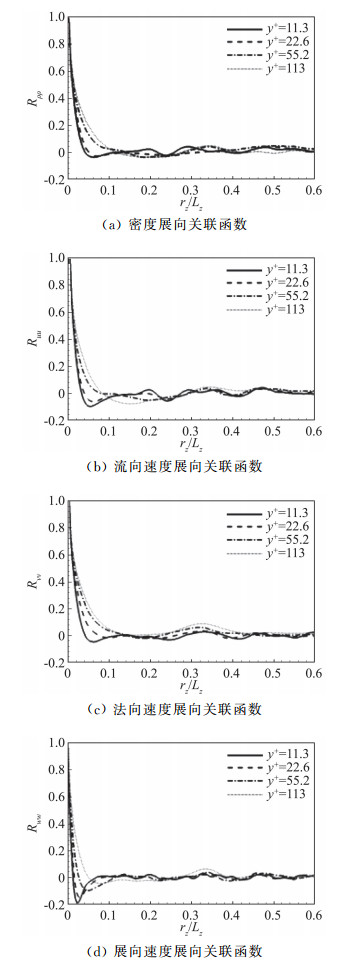 此外,展向空间关联函数在边界层内的分布可以验证展向计算域尺度的合理性[20-21]。图 5给出了展向空间关联函数在法向四个位置的分布。如图所示,随着展向空间尺度增加,密度、流向速度、法向速度、以及展向速度的展向空间关联函数在不到半个展向计算域的距离就已衰减趋为0。可见,本文所选取的展向计算域尺寸是足够大的,且在展向方向采用周期性边界条件是合理的。