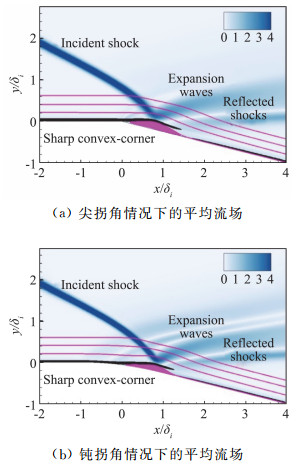 图 6(a)显示,在尖拐角情况下,膨胀波系分布较为集中,剪切层从拐角后缘平滑脱泻,分离泡比较饱满。相对地,在钝拐角情况下,图 6(b)中膨胀波系更为分散,分离泡高度相对平滑,剪切层与壁面之间的距离较小。