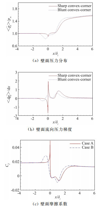 图 7 壁面平均压力、流向压力梯度以及摩擦系数 Fig.7 Averaged wall pressure, streamwise pressure gradient and friction coefficient |