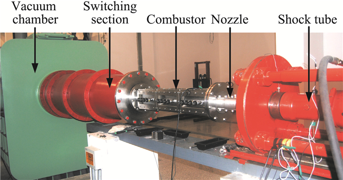 1 激波加热超声速燃烧室直连式试验台为了开展飞行马赫数8和9的超燃冲压发动机直连式试验研究,对中国空气动力研究与发展中心的FD-14激波风洞进行了改造,改造后的激波加热超声速燃烧室直连式试验台如图 1所示。试验台由激波管、喷管、燃烧室、转接段及真空箱等组成。设计了两组喷管,喷管出口马赫数为3.5和4.5,分别用于模拟飞行马赫数8和9的超燃冲压发动机燃烧室入口气流条件。该直连式试验台模拟的飞行条件如表 1所示,其中Mae为喷管出口马赫数,Ma∞为飞行马赫数,H为飞行高度。