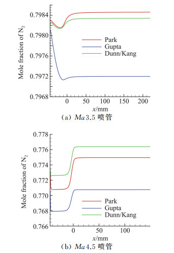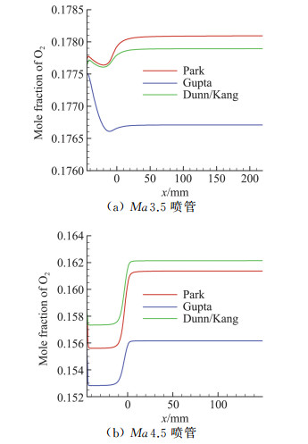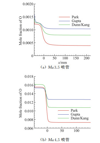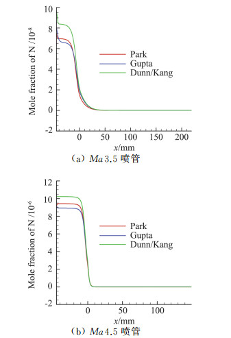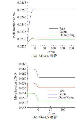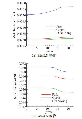 对比Park、Gupta、Dunn/Kang三种纯空气化学反应动力学模型可以看出,当采用Gupta反应模型时,N2和O2的离解程度最大(图 7、图 8所示),因而产生的O原子及NO含量相比其他两个反应模型而言更高(图 10、图 11所示)。在Ma3.5喷管出口,采用Gupta模型计算获得的O原子含量比其他两个反应模型高37.5%或175%,NO含量比其他两个反应模型高8.7%;在Ma4.5喷管出口,采用Gupta模型计算获得的O原子含量比其他两个反应模型高19%或78.6%,NO含量比其他两个反应模型高7%或19.8%。但是总的来说,三个反应模型计算获得的各个组分在喷管内部及喷管出口截面的分布规律是一致的。