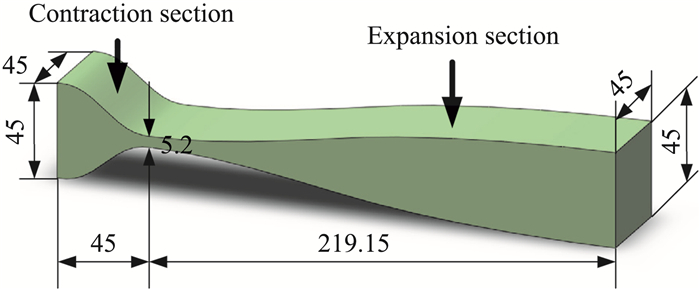 马赫数3.5和马赫数4.5喷管均为二维型面喷管。马赫数3.5喷管如图 2所示,喷管入口截面和出口截面均为45 mm×45 mm的正方形,收缩段长度为45 mm,扩张段长度约为219 mm,喉部高度为5.2 mm。马赫数4.5喷管的喉部高度为1.5 mm,扩张段长度为149 mm,其余结构尺寸与马赫数3.5喷管相同。