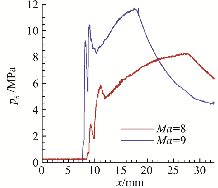 本试验台为反射型激波风洞,风洞运行模式为过缝合运行模式,驱动气体为氢气和氮气的混合气。采用氮气代替空气作为实验气体,对飞行马赫数8(对应Ma3.5喷管)和9(对应Ma4.5喷管)两个状态进行了调试,图 3为试验获得的p5(即激波管5区的压力,也就是喷管入口总压)压力曲线。由图可以看出,飞行马赫数8和9两个状态的有效试验时间分别为8 ms和5 ms,平均总压分别为5.9 MPa和9.5 MPa。两个状态的总温通过试验测得的激波马赫数计算求得,分别为2520 K和3380 K。试验状态均达到了设计状态。