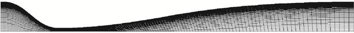 计算采用FLUENT计算流体力学软件,湍流模型采用标准k-ε模型。由于激波风洞的有效试验时间为毫秒量级,在此时间内喷管壁面的温升很小,因此,计算时将喷管的固壁设置为等温壁(温度300 K)。由于Ma3.5和Ma4.5喷管均为二维喷管,且上下结构对称,因此,只需对喷管上半部分进行二维数值模拟即可。两个喷管的计算网格均采用结构网格,喷管近壁面第一层网格厚度均为0.01mm。为了更准确地模拟流动,在喷管近壁面区域和喉部区域均进行了网格加密。Ma3.5喷管和Ma4.5喷管沿流向和法向的网格数目分别为320×110及260×110。Ma3.5喷管的网格如图 4所示,Ma4.5喷管的网格划分方法与Ma3.5喷管类似。