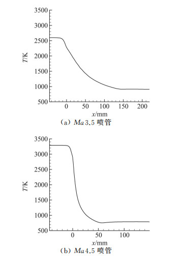 由图 7~图 11可以看出,在两个喷管的扩张段,气流流速很高,此时流动特征时间小于化学反应时间,这就使得在喷管扩张段,N2、O2、N、O、NO等各个组分的摩尔含量基本不再发生变化,即在喷管扩张段,流动为典型的“冻结流”。