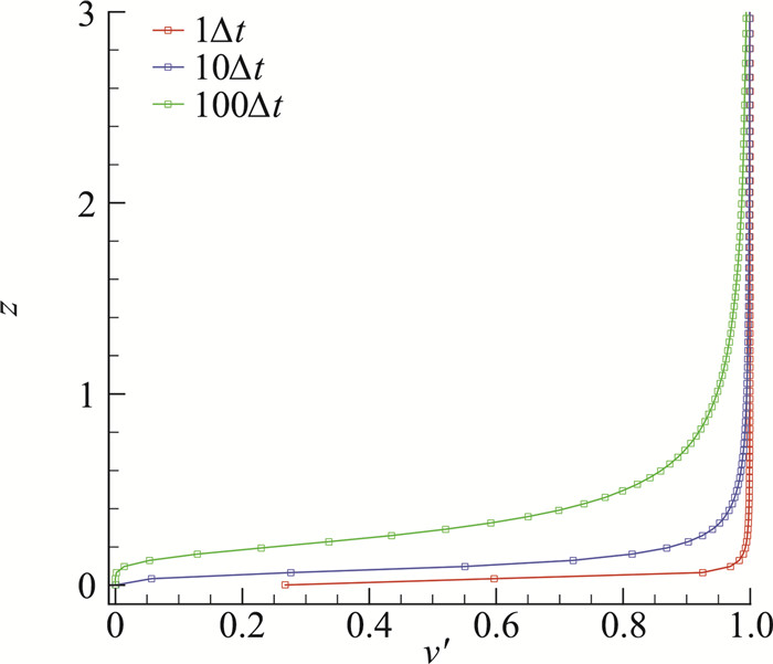 假设有一均匀流动的展向脉动速度固定为v′=1,网格和参数采用下文中的设置,但壁面处理为滑移壁面。这样,流动的变化仅受到模型公式(1)的影响。图 1给出了1、10、100时间步后任一位置处v′沿壁面高度的分布情况。从图 1中可以看到,模型对展向流动的衰减作用, 越靠近壁面越强。即使在离壁面稍远的位置处,多次的衰减也将使展向流动趋于滞止。显然,模型只能削减速度的大小直到v′=0,然后模型不再起作用,速度方向也不会因此改变。