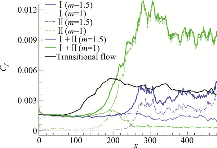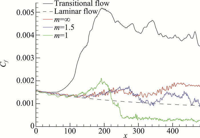m=∞对应的是流向阻力小到可以忽略的情形,因此阻力仅来自壁面摩擦。对于m=1.5和m=1,图 10给出了总阻力系数及其两部分系数的分布。转捩开始后生成的大尺度涡结构激发羽毛模型,可以看到,由此带来的反作用力阻力开始迅速增长并在湍流区维持较高水平。从总阻力系数来看,转捩之后阻力系数相比层流时显著增大,这样就与湍流区阻力比层流区阻力大的认知是一致的了。以阻力开始突增的点为转捩开始的位置,则m=1.5对应的转捩起始位置在x=240附近,而m=1对应x=160附近。此外,转捩之后与不加模型的平板阻力相比,m=1.5的总阻力仍然小一些,而m=1时反作用力带来的阻力占据了主导,总阻力不降反而增加了不止一倍。