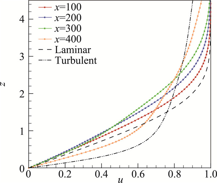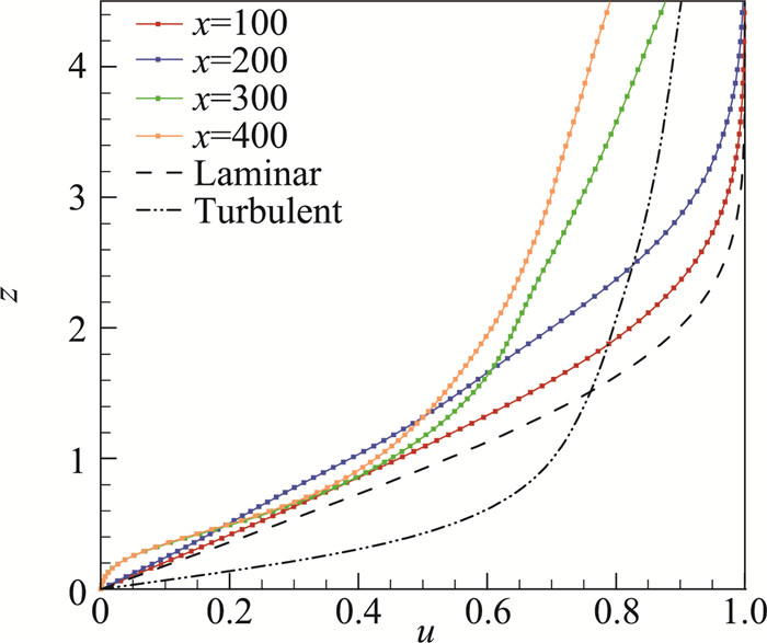 图 3所示为无量纲的边界层速度分布。在入口x=0处,速度分布是典型的层流剖面,而在x=300处,速度分布已经演化为典型的湍流剖面。这说明使用的数值方法和计算设置可以反映层流到湍流转捩的过程。