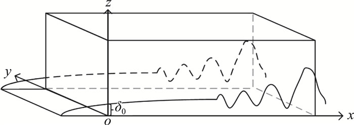 2.2 计算设置计算域如图 2所示。基本流为Blasius相似性解,在计算域入口处需引入扰动。初始扰动由3个T-S(Tollmien-Schlichting)波组成,具体形式如下