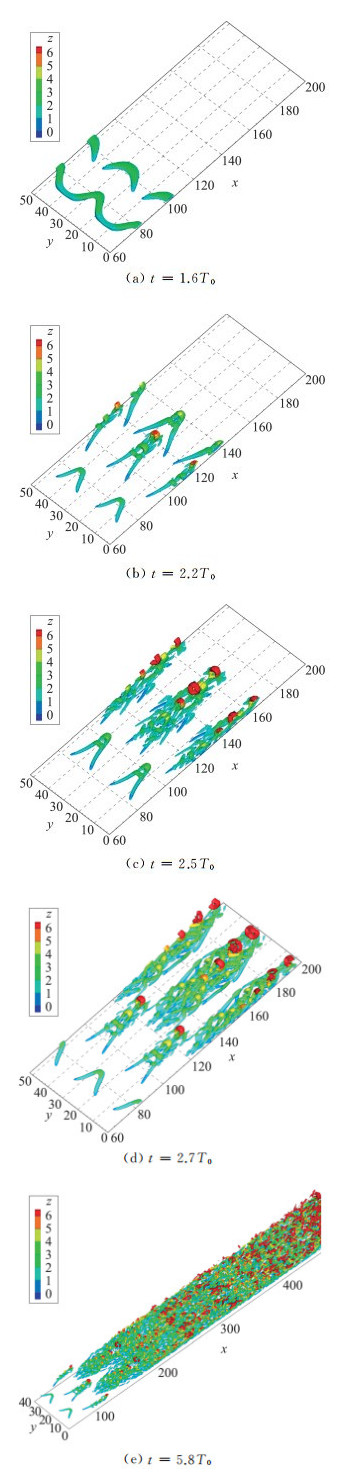 图 5 转捩过程中不同阶段的涡结构 Fig.5 Vortex structure in different stages of transitional flow |