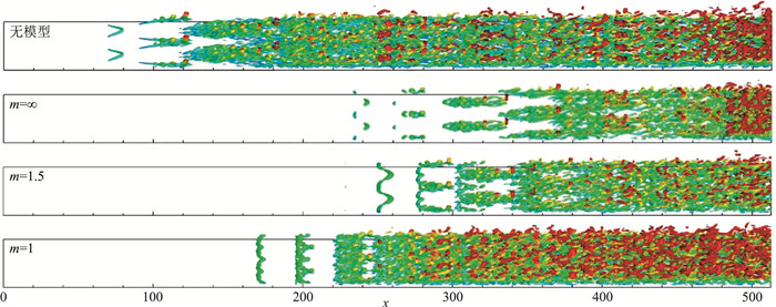 图 6给出了加入模型后计算得到的全流场的涡系结构图,上一小节中未加模型的结果也一并给出作为对比。可以看到在加入羽毛的阻力模型后,开始形成大尺度涡的位置较无模型情况明显靠后。无模型情况下,x=100附近就已经形成了发卡涡,而加入模型且m=∞时,x=300处发卡涡才出现,并且转捩到湍流过程中形成的涡系要稀疏得多。不同的m值得到的结果有显著的差异。m=1.5与m=∞相比,开始形成典型涡结构的位置相差不大,但后续过程中形成的涡系结构要丰富一些。m=1情况下,开始形成涡的位置较m=∞明显提前,x=200附近已经可以看到形成的发卡涡了。此外,之后形成的涡系结构相较之下也要丰富得多。