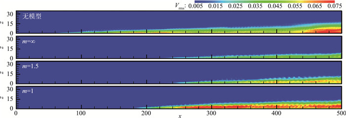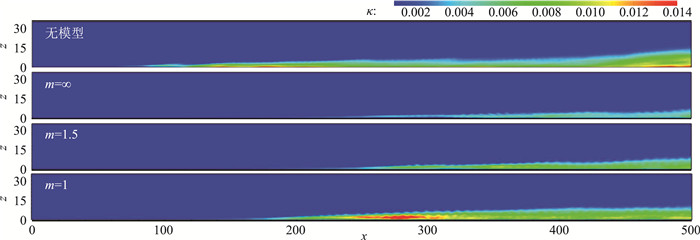 从图 7给出的展向脉动速度均方根沿平板的分布可以看到,模型只对展向脉动速度起作用即m=∞时,展向脉动的范围和强度相比无模型时明显减小了。而展向和流向的阻力模型均起作用,即m=1, 1.5时,展向脉动的范围和强度相比m=∞时变得更大,且模型带来的流向阻力越大,范围和强度增大得越多,这与图 6中观察到的涡结构分布情况也是一致的。值得注意的是,m=1时尽管范围比无模型时要小,但是部分区域展向脉动的强度却增大得比无模型时还要大。图 8给出了平均湍动能