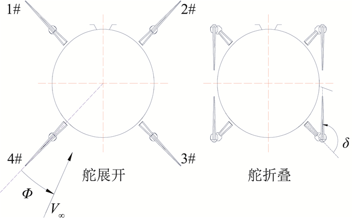 机载导弹一般由弹身+4片尾舵组成, 驱动方式有扭簧、扭杆及火工品作动筒等多种[7].展开过程会受到飞行高度、速度、迎角/侧滑角, 载机/导弹气动外形等多种因素的影响.展开过程中不仅要保证展开的同步性,而且还要保证到位后不能有过大的冲击载荷[10]。然而在展开的过程中,4片尾舵处于弹身的不同方位,其所受的气动载荷各不相同,而且随弹体滚转角而有较大的不同,要保证同步性和防冲击的要求,就必须要对折叠舵外翼的气动特性作全面深入的研究。