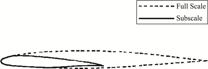 由于结冰一般发生在翼型的前缘,因此,一种折中的方法是采用混合翼型设计,如图 1所示,其外形特点是保持对于结冰影响至关重要的全尺寸前缘,缩短对于结冰影响不大的后缘长度,通过设计后缘使前缘附近的流场与原始翼型一致[5]。这种方法的优势在于,由于保证了前缘结冰部分几何外形不变,继而该处的结冰能够保持与全尺寸翼型一致,结冰试验的模拟精度更高。